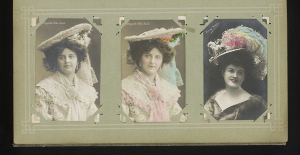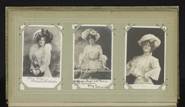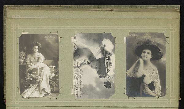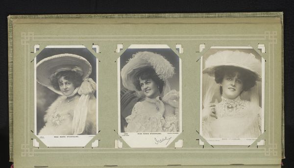 This is a mounted photograph from an album of Antonio Garcia. It presents three portraits of women, including Soledad Villafranca and Lilie Elsie. The composition is structured by the clear separation of each portrait, creating a triptych-like effect. Each woman is framed within a distinct pictorial space, yet linked through the shared materiality of the photographic print and the album page, prompting a comparative reading. Garcia’s emphasis on texture, from the lace details to the plush furs, articulates a semiotic code of femininity and status. Note how the tonal range, from stark whites to deep blacks, draws our eye to specific areas within each portrait, guiding our interpretation of each sitter’s character. Ultimately, the photograph invites us to consider how representation is constructed through stylistic choices, and how these choices may reflect or challenge prevailing social narratives. The work becomes a study not only of individual likeness but also of the cultural values embedded within photographic portraiture.