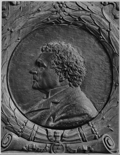 Editor: This striking relief portrait, "Francis James Child," by Leila Usher, commemorates the first Professor of English at Harvard. The laurel wreath feels very academic and honorific. What cultural meanings do you see embedded here? Curator: The laurel, of course, signifies enduring fame, a classical reference to intellectual and athletic triumph. But look closer. What does the choice of oak leaves, berries, and the acanthus at the top tell us about Professor Child's legacy? Editor: They suggest strength, wisdom, and perhaps even resilience. Does this speak to his character or perhaps his academic contributions? Curator: Precisely. Usher uses symbolic language to portray not just a likeness, but the essence of Child's contributions to Harvard's cultural memory. This reveals how the institution wished to remember him. Editor: That’s fascinating; I hadn't considered how thoroughly symbols communicate values and shape legacy.