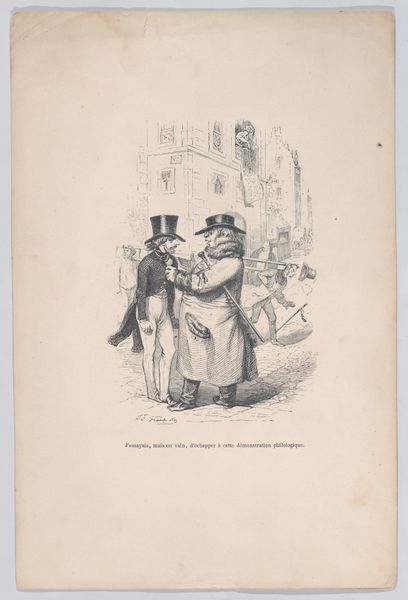 Curator: Let's take a look at this lithograph by Paul Gavarni, created around 1838. It’s titled "Toerist biedt snuiftabak aan twee kunstenaars aan" – A Tourist Offering Snuff to Two Artists. Editor: My first thought? This is delicious! The subtle line work just vibrates with the everyday absurdities we still recognise now. The energy makes me feel like I'm eavesdropping on a particularly witty street scene. Curator: Gavarni, of course, was a keen observer of Parisian society. This lithograph would have been printed en masse, appearing in publications and readily consumed by the burgeoning middle class. The paper itself becomes part of the story - a medium accessible for commentary and consumption. Editor: I imagine the smell of ink lingering in the air, as potent as the snuff itself! Do you think Gavarni felt a kinship with his subjects or a detached amusement? Look at their faces—so puffed and distinguished! The snobbery of the elite… or is it a tenderness for their dedication to refined leisure? Curator: Perhaps both? His lithographs often walked that line, satirising social mores while acknowledging the human element. Snuff-taking itself was a ritual, linked to status and conspicuous consumption. These little everyday habits became important class signifiers. The very act of him distributing these artworks further implicates art in consumption! Editor: I love how immediate lithography seems—direct from mind to stone to paper. You see his quick hand; it mirrors the prompt gestures he represents! I almost wish I was in that busy Parisian scene… minus the actual smells. Curator: The medium allowed for relatively rapid production, catering to the public’s demand for images, which ties into his art being reproduced in mass quantities. Each print becomes evidence of the artistic labor and its distribution network. Editor: That's it: labour! Perhaps they look so tired from breathing those fumes as they labour over an illustration… A good artist makes any medium breathe a little more. I feel seen. I think this image understands me, and all my odd contradictions and ambitions. Curator: Precisely, we become implicated as the viewer - just as these "artists" of Gavarni’s day became implicated in their rituals of social status. His satirical lens highlights how meaning and value are manufactured through the circulation of objects and ideas, even seemingly minor habits of consumption. Editor: Yes, even in a pinch of snuff. Curator: And printed images of a street corner with passing members of high society. Food for thought indeed.