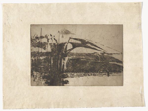 Curator: This is Fred Williams' "Scrub at Lilydale," held in the Tate collection. It’s an etching, a small piece, less than 25cm on its longest side. Editor: It’s… bleakly beautiful, isn’t it? Sparse, raw. The lines dig in, almost violently. Curator: Williams often reduced the Australian landscape to these skeletal forms. The scrub becomes a symbol of resilience, of survival in a harsh environment. Editor: It reminds me of old photographs of war zones. The starkness, the sparseness. There's a vulnerability here, a sense of something exposed. Curator: Absolutely. The lack of detail forces us to project our own feelings onto the scene. It becomes a mirror reflecting our own anxieties. Editor: You know, I think that’s the genius of it. It’s not just a landscape; it's a landscape of the mind. It haunts you, doesn’t it? Curator: It does. It speaks to something primal within us, this elemental struggle against the odds.