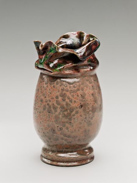 Curator: It’s my pleasure to introduce George Ohr's ceramic "Pitcher," likely crafted between 1895 and 1913, currently residing at the Metropolitan Museum of Art. Editor: My initial reaction is its earthy vulnerability. It has this mottled glaze, as if grown organically, but the crisp handle gives it a modernist touch. The form is both functional and deliberately disrupted. Curator: Indeed. The pitcher's surface, undulating like disturbed water, invites touch. This piece is indicative of Ohr’s departure from traditional pottery norms of the era. He’s almost dismantling the object, challenging functionality itself. Note, too, the dynamic interplay between the smooth, reflective glaze and the matte stoneware. Editor: I find that "dismantling" fascinating. Ohr used extremely thin clay walls to allow the vessel to move organically within the kiln. His physical interaction with the clay—pinching, folding, and tearing—it all embodies an expressionistic physicality rarely seen in functional ceramics of that period. Curator: Exactly, Ohr challenges classical form with gesture. The seemingly random manipulation reveals an interest in pure, abstract form. How do you see it functioning in art historical discourse? Editor: In relation to American Art Nouveau, Ohr shows an interest in handmade craft while simultaneously disrupting its norms. Ohr elevated it by engaging with labor and pushing technical constraints to their limits, rather than solely prioritizing decoration or beauty. It reminds us that art history is not only made of painting or bronze, but also mundane clay from Mississippi. Curator: Ultimately, it seems Ohr presents the functional as dysfunctional, or rather he asks us to renegotiate with purpose. It stands as both practical object and sculptural statement. Editor: Absolutely, Ohr's legacy urges us to reconsider conventional associations. It's a conversation, rather than an affirmation.