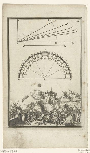 Editor: This is an engraving by Romeyn de Hooghe from 1672, titled "Illustration for 'The Labor of Mars' by Allain Manesson Mallet." It combines geometric figures with a battle scene. It's quite unusual—the cold geometry seems at odds with the chaotic energy of the war depicted below. What do you see in this piece, especially considering the time it was made? Curator: The juxtaposition is precisely what's intriguing. Consider the social and political climate of 17th-century Europe, rife with conflict but also witnessing the rise of Enlightenment thought and scientific inquiry. This engraving beautifully encapsulates that tension. The geometry represents a desire for order, for rational understanding of the world, while the battle scene reminds us of the chaotic realities of power and territorial struggles. How might this be a comment on the role of knowledge itself? Editor: So, the rigid forms are meant to stand in for order and understanding, and are contrasted with the disorder of war? It's interesting how the battle scene appears almost… ornamental, contained within the frame. Curator: Exactly. De Hooghe was a key figure in shaping public opinion through imagery. Consider how this image functions in the broader context of military strategy texts. Is it glorifying war, or perhaps subtly critiquing its seemingly endless repetition, by reducing it to an almost decorative element subservient to geometry? The figures aren't heroicized. Editor: It does make you wonder. So, the purpose of art here isn't just aesthetic; it's deeply enmeshed in the socio-political dialogue of the time. Curator: Precisely. Understanding this requires us to look beyond face value. Think about the book's audience. Who were they, and how might this imagery have shaped their perception of war and power? It really brings the institutional purpose of art into sharp focus. Editor: That's fascinating. I came in seeing a strange composition, but now I understand how it actually mirrors the anxieties and aspirations of its time. Thanks for that new perspective! Curator: Indeed! Looking at art as more than pretty pictures provides crucial insights into the forces that shape society itself.