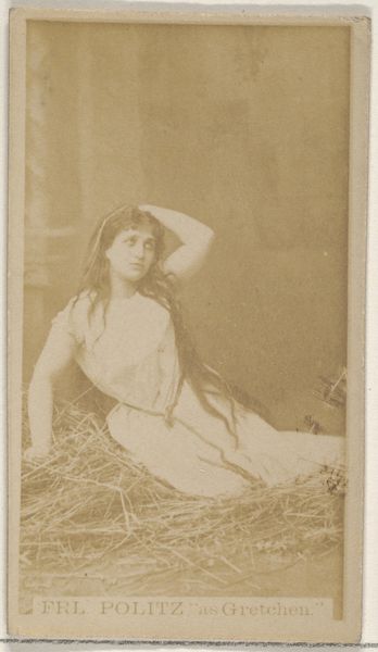 Curator: Immediately, there's this languid, dreamlike quality. A sepia-toned reverie, almost. Editor: It's a photograph, right? More precisely, a print, one of the "Actors and Actresses" series produced by Allen & Ginter between 1885 and 1891 for Virginia Brights Cigarettes. Specifically, this card is titled "Margarette Urbanska, from the Actors and Actresses series (N45, Type 8)." It’s part of a larger consumer culture artifact now housed in the Metropolitan Museum. Curator: Right, Urbanska looks as though she’s stepped right out of a pre-Raphaelite painting. Reclining, a book open…is it an invitation, or is she completely lost in the narrative? The light seems to catch her hair like spun gold, yet the shadows ground the image. Editor: It's intriguing how tobacco companies used images of beauty and artistry to promote their products. What looks like art on the surface is deeply embedded in production and consumption cycles. This photograph, mass-produced and distributed in cigarette packs, made Urbanska accessible and consumable. Curator: Consumable…a sharp way to put it, and probably accurate. Still, that pose—it's consciously artistic. It feels like she's staging herself for an audience beyond just those buying cigarettes. There's an intent to communicate something about allure, maybe a little defiance. Editor: It highlights the commodification of image. The photographic print flattens not just the image itself but Urbanksa's very being. How does a celebrated stage actor then circulate into mass culture? Also, it brings up all sorts of questions about the labor involved – from the studio to the factory. Curator: But, labor aside, doesn't it hint at something profound about human connection and how even ephemeral images capture slivers of someone's soul? What was it like for her, as a performer, knowing this version of herself was being spread far and wide, tucked in cigarette packets? Editor: And who held these photographs? Smoker collectors of promotional merchandise? What material relations exist within this image, beyond artistry and affect? Thinking through it that way makes me a bit more aware of its limitations as a source. Curator: It does make one question how we understand the impact these images might have made then, and even now, knowing the hands that created them and the industry that drove them into being. Editor: I appreciate the added context; this seemingly simple photographic print pulls at threads tied tightly to society, material culture, performance, and production, too. It is worth another look.