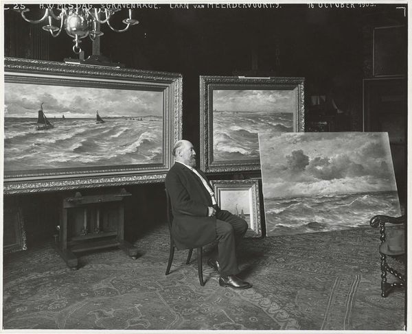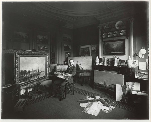 Curator: Here we have "Julius van de Sande Bakhuyzen in his studio on the Huijgenstraat 19 in The Hague," a gelatin-silver print taken after 1903 by Sigmund Löw. Editor: What a remarkable portrait! The artist, framed by his own landscapes, all muted greys and soft light – it’s like he’s constructed his own world, piece by piece. Curator: Exactly, Löw captured not just a portrait, but an environment steeped in the means of production, dominated by finished and unfinished work. Observe the textures – the smooth photographic print contrasting with the impasto visible in some of Bakhuyzen’s framed paintings. Editor: I am drawn to the relationship between Bakhuyzen's artistic labor, captured here, and the expectations of artistic genius at the turn of the century. How does this representation challenge or reinforce those romantic notions? The very ordinariness of the setting pushes against the grain. Curator: It's intriguing how Löw, with his photographic lens, places himself in a lineage of artists portraying artists, participating in the politics of representation. But whose gaze are we meeting here? It’s difficult to assess if Bakhuyzen collaborated or was passive in the photographic process. Editor: Perhaps he yielded control to Löw, allowing the photographer's interpretation to become part of the narrative. But consider the material reality. The print itself—the paper, the chemical processes, the photographer's skill—contributes to its own meaning, right? Curator: Precisely, the image documents Bakhuyzen's work while becoming another layer, adding new complexity to the existing artistic context. The monochrome enhances that sense of layers of history and material making that inform meaning in the image. Editor: Thinking about craft, technique, and agency in photographic portraiture provides invaluable context for reassessing these historical records, don’t you think? Curator: Indeed, considering photography, an emerging industry itself, through the same critical lenses helps expand our understanding of late 19th and early 20th century art. Editor: Well, this image encourages one to think through both subject and object with a clearer perspective.