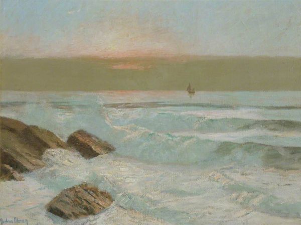 Editor: Here we have Carolus-Duran’s “Seashore at Audresselles,” an oil painting from 1917. It feels so calm and almost melancholic to me, with those muted greys and greens. What strikes you most about this work? Curator: I find it interesting to view this piece through the lens of its historical context. 1917…World War I was raging. Artists during this period grappled with representing a world steeped in violence and uncertainty. Given that, how might this seemingly peaceful seascape function as a commentary, perhaps an escape, on the realities of war? Editor: That's a fascinating angle! I hadn't considered the war's influence. Could it be a form of resistance, perhaps? A longing for simpler times expressed through art? Curator: Precisely! Consider also the Impressionists, Duran's artistic forebears. They challenged academic painting by focusing on everyday life and fleeting moments. Duran builds on that legacy here, depicting a seemingly insignificant scene, yet during wartime, this ordinariness becomes significant. It's a visual poem about perseverance, a return to something stable. The beach remains, despite all. Editor: I see what you mean. So the choice of subject matter, a quiet seashore, is itself a statement. Was Duran actively involved with the war? Did that impact the perception of his work during his time? Curator: That's exactly the right question! Duran didn’t serve but he, along with many other artists, actively engaged in fundraising and patriotic art production, contributing to the cultural narrative of the time. Editor: This makes me view the painting in a whole new light. Thank you, this really deepens my understanding of it! Curator: My pleasure. Examining art in relation to social and political movements makes it more interesting, doesn't it?