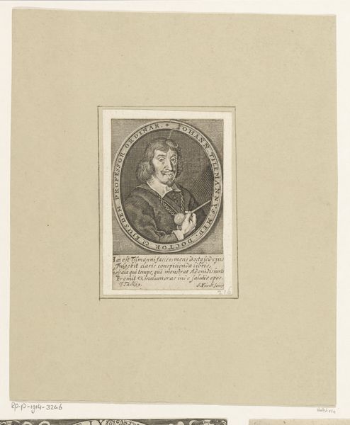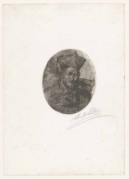 Here is the audio guide script: This etching, made by Cornelis van den Berg, captures the likeness of Jan Mandijn. Dominating the composition is the sitter's peculiar hat, a soft cap that speaks volumes about the sitter's identity and era. Such headgear, while seemingly simple, echoes through art history, hinting at a connection to artisans, scholars, or perhaps those who wished to signal a detachment from courtly fashion. Consider the recurrence of similar caps in depictions of philosophers and artists across different epochs. This sartorial choice becomes a symbol of creative or intellectual identity. We see a symbolic link forming across centuries, revealing an unconscious desire to align oneself with a lineage of thinkers and creators. Observe also the pipe in Mandijn’s mouth, a symbol of contemplation and leisurely pursuit of thought. This emblem, like the hat, transcends time and place, resurfacing in various guises to denote intellect, or the simple, human pleasure of pausing for reflection. It is a visual echo that reminds us how cultural symbols are continuously reshaped and reinterpreted.