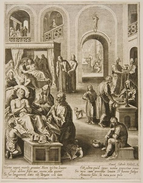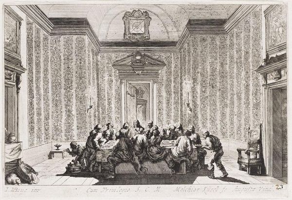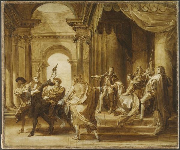 Curator: Welcome! We're standing before Pieter de Hooch's "Company Making Music," housed here at the Museum der Bildenden Kunste. Editor: It’s striking, isn't it? That austere interior space, punctuated by figures grouped rather theatrically. And is that a tiny dog I see scampering around? There's such a chill formality but with the warmth of that ochre yellow dress it adds softness and a lovely tonal center. Curator: Absolutely. The artist uses that architectural rigor—those precise receding lines, those imposing arches—to emphasize the human drama. It’s interesting how the cool, ordered space serves as a foil to the more fluid emotions suggested by the musicians. I wonder, could De Hooch have a musical background as well as an art backgroudn? Editor: A clever juxtaposition. Consider the rhythmic pattern established by the tiled floor. That grid enforces structure, but the figures—caught mid-gesture, mid-song— introduce movement. I'm almost distracted by what I think I can see occurring in the far archway of the building? The color composition as a whole really invites the viewers eye. What else can we consider of it? Curator: Think about the clothing of these musical players, and the rich tones versus the muted, cooler palettes in the architectural space...The clothing suggests class, position, confidence in their time, a symbol of Dutch golden era wealth. Editor: The painting itself possesses an undeniably tranquil quality; I find myself utterly captivated, nearly lulled into a harmonious trance by the geometric symphony created by de Hooch. The formal architecture of this setting seems so appropriate for an ode to musical making. The artist may also subtly probe questions of the ephemeral versus eternal, capturing a moment that seems destined to dissolve away, within such steadfast walls. Curator: Very much agreed! De Hooch truly captured something sublime here. Editor: What a refreshing perspective this painting offers! It does make you reflect on the intersections of daily existence.
