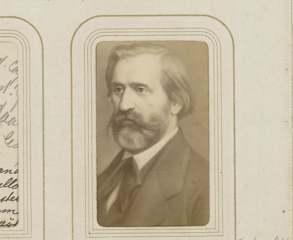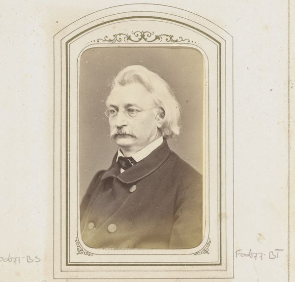 Curator: Looking at this framed photograph, "Portret van een man met snor," produced between 1865 and 1903 by De Lavieter & Co., I'm immediately struck by its ability to capture the rigid social codes of the late 19th century. Editor: The first thing that catches my eye is that magnificent moustache! It's incredible—almost like a sculpted extension of his personality. It seems impossibly fragile, which must reflect on how he cared for it! Curator: Precisely. Studio photography was gaining popularity, providing a carefully constructed image for public consumption, reinforcing societal ideals of masculinity and status through controlled presentation. Consider that elaborate grooming a performance, meticulously crafted for the lens. Editor: Yes, the production of his self image. And if you look closely, you see the photographic process itself. The tones are limited, creating a very specific palette and a distinct kind of texture you only find in early photography. I wonder about the specific chemicals, the length of exposure. These aspects clearly dictated the kind of aesthetic possible for the photographer. Curator: Those limitations, though, became aesthetic strengths, contributing to the genre painting aspect it references. These portraits helped solidify identities while constructing new visual vocabularies about how status and gender could be understood and replicated through widespread distribution. Photography democratized portraiture, and made images and societal power more attainable. Editor: I agree, even his posture looks self-conscious and crafted! Still, what strikes me, despite this, is the implied human labor. The arrangement of light, the patience to develop the negative, to retouch the photograph; the frame. There's an almost invisible system of craft underpinning even a simple studio shot. Curator: Indeed. It reminds us how images become entwined within our evolving systems of value, reflecting class and cultural aspirations—even down to that perfectly sculpted moustache. Editor: Well, looking at it from a maker's point of view I now want to better understand 19th century photographic printing. How was it received at the time?