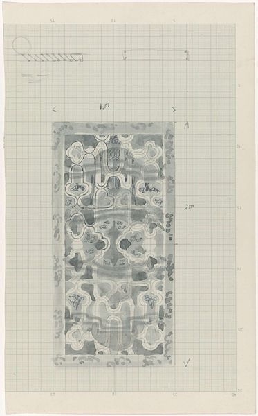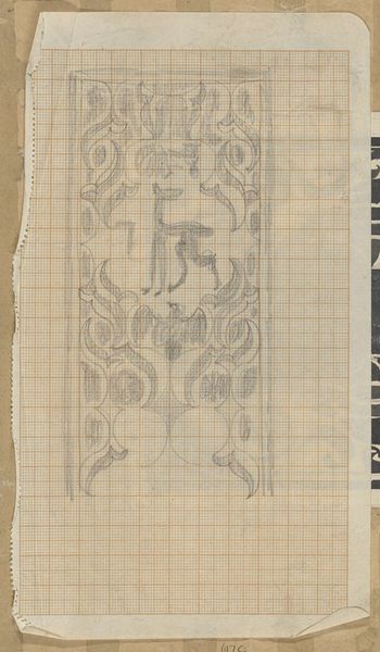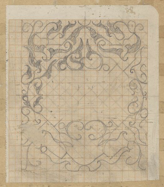 Curator: Here we have Carel Adolph Lion Cachet's "Decoratief ontwerp," dating from between 1874 and 1945. It's a pencil drawing on paper, currently held in the Rijksmuseum collection. Editor: My first impression is one of geometric constraint—those precise lines creating something ornate, yet obviously carefully measured and planned. Curator: Absolutely. Look at the grid meticulously overlaid. This piece serves as an example of the intersections between art and industry prevalent during Cachet's time. Consider that Cachet had links to industry—designing for textiles, ceramics and advertising—blurring any clear boundary of fine art and the decorative. Editor: Yes, that rigid underlying structure definitely plays with that tension, creating something almost architectural. And what of the botanical elements within the symmetry? It reads as something caught between natural forms and human intention. Curator: That’s very astute. Art Nouveau, particularly, celebrated the handmade, but it existed alongside new technologies for mass production. The artist was tasked with adapting form for manufactured objects, thus influencing design across a variety of goods. The social impact cannot be denied! Editor: Looking more closely at this pencil sketch—observe the interplay of delicate lines—there is a balance that borders on tension, all of which elevates a utilitarian geometric shape into an elegant form of artistic expression. Curator: It does provoke questions about how "design" can be elevated through hand drawing and also distributed to be reproduced by other commercial entities, a point, no doubt about the power and challenges of production and appropriation of visual material. Editor: A perfect blend, then, of form and content; the constraints enhancing its ornamental features, bringing a natural form, a geometric shape and social and industrial ideas to a point. It holds such fascinating contrast. Curator: It really does demonstrate a rich dialogue between industry and individual expression. Something worth noting.