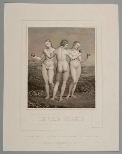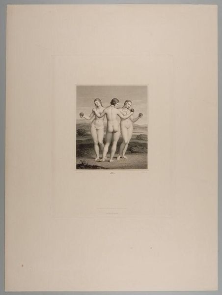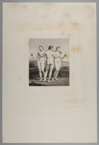Editor: So, this is "The Three Graces" by François Forster, made in 1841. It's an engraving. What immediately strikes me is its kind of classical purity. It’s very academic. How do you interpret this work in a contemporary context? Curator: This print really speaks to the complex historical relationship between representations of the female nude and power. Think about who commissioned these kinds of images, and for whom they were intended. Can we consider how this neoclassical depiction, with its emphasis on idealized beauty, might actually reinforce certain patriarchal ideas about women? Editor: That's interesting, because initially it just felt very...distant. What makes you say it reinforces patriarchal ideals? Curator: Well, consider how these Graces are presented: passive, objects of visual pleasure, devoid of individual agency. The context matters. Neoclassical art often served to legitimize the status quo, and in this case, perhaps naturalizing a male gaze. These Graces aren't agents in their own story; they’re being observed. But does the technical mastery evident in Forster's print give any power back? Or complicate the male gaze with the female perspective of the artist's assistants in the atelier? Editor: I see what you mean. It's easy to just admire the skill, but it's so important to consider who benefits from these images, and whose stories are being left out. Thanks for the insight! Curator: Exactly. Thinking about whose perspectives are privileged – or erased – that’s crucial to how we understand art’s role in shaping our society. I am always delighted to see a student engaging in questioning of the motives that gave birth to this artwork.