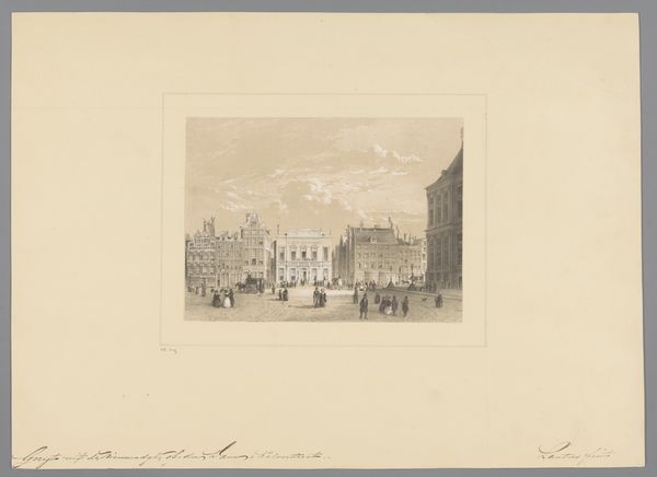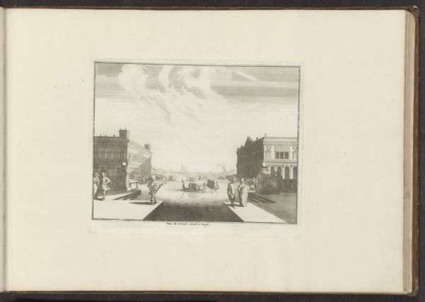 Editor: This is Willem Hekking Jr.'s print "Oostenburgermiddenstraat in Amsterdam," placing us in the Netherlands sometime between 1836 and 1905. It's a beautifully detailed cityscape done with etching and engraving. It strikes me as both ordinary and dreamlike at the same time. What jumps out at you? Curator: Immediately, I'm drawn to the industrial smoke subtly rising in the background. Juxtapose that against the seemingly mundane street scene – people conversing, children playing. How do you feel that symbol shapes our reading of daily life depicted in the foreground? Editor: I guess it shows how industry was becoming an inescapable part of even everyday experiences back then. It’s interesting to see it framed almost passively. It isn't overpowering the image, yet its presence colours the atmosphere quite literally. Curator: Precisely. Notice how the artist hasn't shied away from capturing ordinary figures - the locals, doing normal daily actions. The light, perspective, and the street's architecture itself all collaborate to weave a narrative about community life being reshaped by modernization. Consider how it might be seen as nostalgia viewed from the perspective of today? Editor: That makes a lot of sense! It's like seeing the cusp of a changing world caught in monochrome. Now that you point it out, even the classical architecture in the frame feels symbolic. Curator: Exactly. Images speak volumes, silently capturing the evolving world through suggestion and connotation. Consider each stroke; the artist's selection highlights a period not just of representation, but great symbolic import for shifting societies. Editor: Thanks for opening my eyes to the layers of meaning in this seemingly simple street view. I had missed all the deeper layers the monochrome suggested. Curator: And I am reminded to reflect on our cultural narratives contained within a single moment represented artistically.