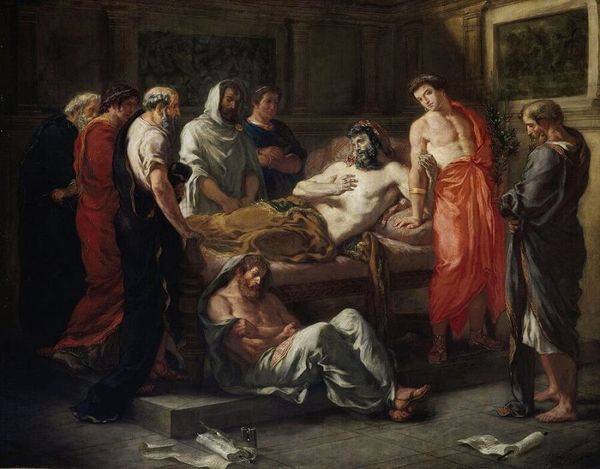 Editor: This is John Trumbull's "The Woman Taken in Adultery," painted in 1811 using oil paint. It strikes me as a powerful and somewhat theatrical scene. The contrast between the pleading woman and the judgmental crowd is palpable. What do you see in this piece, particularly concerning its historical context? Curator: This painting reveals much about the social anxieties of the time. Trumbull, having witnessed the revolutionary spirit in America and France, likely saw this biblical story as a parable about judgment, forgiveness, and social order. Notice how Christ is positioned, seemingly shielding the woman, questioning the very authority that seeks to condemn her. How does that placement, against the imposing architectural backdrop, inform your understanding? Editor: I hadn't considered the architectural context so directly. The structure almost seems to represent the established societal rules, whereas Christ seems to offer an alternative. Were there any contemporary debates about public morality that Trumbull might have been referencing? Curator: Absolutely. The early 19th century witnessed rising debates about moral codes and social justice, even questioning who has the power to judge and enforce moral laws. Trumbull positions Christ as a figure challenging traditional patriarchal authority and questioning legalistic applications of scripture. The politics of imagery were very deliberate; do you think Trumbull succeeded in this intent to convey the narrative with contemporary relevance? Editor: I see that. Looking at the painting now, I notice a subtle questioning of established power. It makes me wonder if his intention was to inspire dialogue, challenging his audience's perception of societal judgment. Curator: Indeed. This painting invites reflection on our own judgments and the role of institutions in shaping our moral understanding. Trumbull used history to provoke a very contemporary discussion. Editor: I now view the painting with an increased appreciation for the embedded commentary on the sociopolitical norms. Thank you. Curator: My pleasure; seeing historical reflections through the lens of art history helps us unpack its layers.