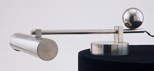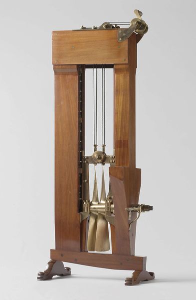 Curator: My immediate impression is that it looks strangely still for what I imagine is a very dynamic mechanism. The brass and the geometry suggest clockwork, but its stillness imbues it with a certain antiquated charm. Editor: Precisely! What you're observing is a piece entitled "De zon, onderdeel van het planetarium, tellurium, lunarium", which roughly translates to "The Sun, part of the planetarium, tellurium, lunarium." Created sometime between 1800 and 1975, it’s crafted from brass and other metals. Curator: So, a component within a larger model illustrating the movement of celestial bodies? The materials do lend a sense of mechanical precision—and the solar sphere on top seems weighted with symbolic importance, right? Like, what would this ‘sun’ have meant to its creators? Editor: In devices such as these, dating back centuries, the Sun wasn't simply a physical body; it embodied enlightenment, divine order, even the very spirit of God and the cosmos as then understood. The piece, regardless of its material, tries to speak of such forces. Curator: Interesting! I hadn’t considered that reading but as a geometric study the sculpture plays a great trick of light and shadow upon itself. Notice, that repetition, those circles. Editor: And the weight of scientific endeavour! We use different devices now to picture the stars and their patterns. It really puts into perspective how knowledge shifts yet leaves such beautiful artifacts behind. Curator: Very true. I am moved to think of past lives pondering their place in our ever changing solar system. The device, after all, would have aided those individuals toward making informed astrological or agricultural observations. Editor: And for me it is now the pure aesthetic form that will last the longest. Its intrinsic design holds as much impact as any reading that might shift from decade to decade.