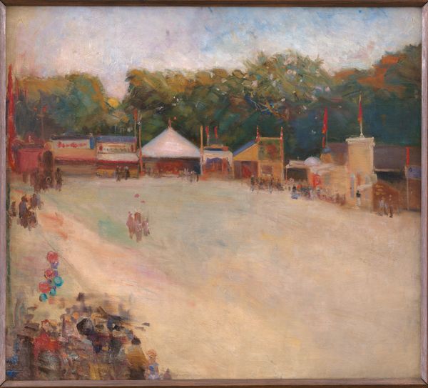 Editor: So, this is William Glackens' "Race Track," painted around 1908 or 1909. It’s an oil painting, and I’m struck by how vibrant the colors are, almost clashing. The overall impression is exciting but also kind of chaotic. What do you see in this piece? Curator: Chaos is a good word for it. It's easy to look at this and see a snapshot of leisure, but Glackens, belonging to the Ashcan School, often used scenes like these to comment on social stratification and the rapidly changing urban landscape. Consider who had access to leisure activities like horse racing in the early 20th century. Who is present? Who is absent? Editor: Right, it seems like a privileged scene. Were there any specific social or political factors influencing Glackens' depiction? Curator: Absolutely. The Ashcan School, reacting against academic traditions, aimed to depict everyday life, particularly the lives of the working class. Glackens, while sometimes depicting more "refined" subjects like this one, was still invested in portraying the realities of his time. The question is: is he celebrating this spectacle, or is he subtly critiquing the social divides it represents? Are we meant to see the excitement, or question the accessibility? Editor: I hadn’t thought about it as a critique. I was just seeing the energy of the scene, the movement. Now I see the contrast between the privileged viewers in the stands and…well, who exactly is doing the work here? Curator: Precisely! Think about the jockeys, the stable workers – all largely invisible in the celebratory atmosphere. Glackens prompts us to consider those power dynamics. How does the artist portray the landscape in relation to its people? Editor: So, beyond the impressionistic brushstrokes and bright colors, it's a painting that invites us to think about social inequalities. It's definitely given me a different perspective. Thanks! Curator: It is a constant invitation to expand our thinking. Looking closely reveals layers of meaning embedded in seemingly simple scenes.