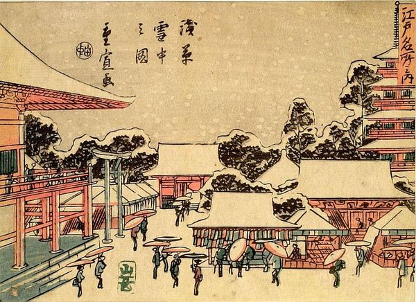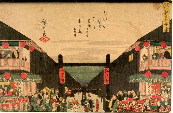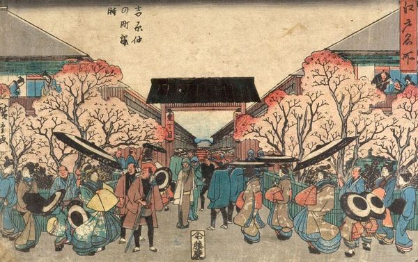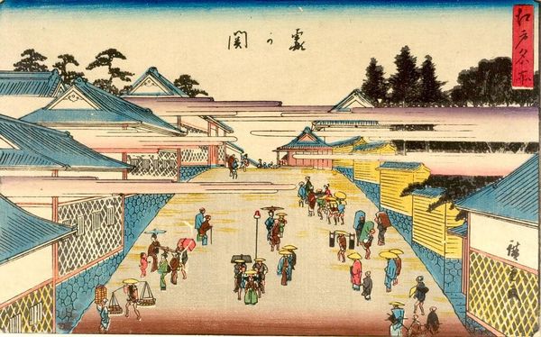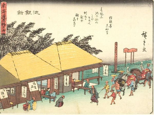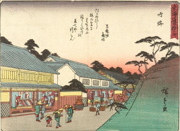 Editor: Here we have Utagawa Hiroshige's evocative print from his "53 Stations of the Tokaido" series. It's bustling with figures, yet there's a sense of quiet contemplation too. What do you see in this piece? Curator: It whispers to me of journeys, both physical and internal. The woodblock technique renders the everyday extraordinary. The muted palette with that burst of sunset... It feels like a fleeting moment, doesn't it? What story do you think it is trying to tell? Editor: A story of connection, maybe? Between travelers and the landscape? Curator: Perhaps. Each figure is a brushstroke in a larger narrative. Hiroshige invites us to imagine their lives, their destinations, their dreams. It's a reminder that even in transit, we are part of something bigger. Editor: I hadn’t thought of it that way before. It is interesting to consider the travellers' stories.