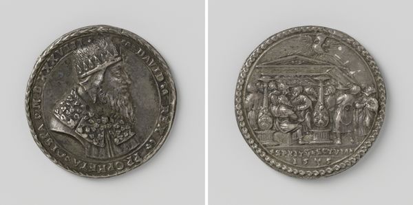 Curator: This piece, titled Carlo Grati, is an anonymous creation from an unknown era. The Harvard Art Museums hold this bronze artwork, a mere 10.5 cm in diameter. Editor: It’s remarkably dense, almost claustrophobic in its composition, especially given its small scale. I'm immediately struck by the contrast between the regal portrait and the chaotic battle scene. Curator: It really encapsulates Grati's image, doesn't it? A military leader memorialized through a specific, almost heroic, lens. How do you think its public reception was shaped? Editor: Monumentally! Consider the era—imagery was power. This piece probably aimed to solidify Grati’s legacy, perhaps during a turbulent period or shortly after a significant victory. Curator: And observe the careful etching of the lettering. The textures create a sense of depth. I'm intrigued by the semiotic relationship between the sword and the kneeling figure. Editor: The symbolism is so charged! It reflects not only Grati's martial prowess but also the socio-political ideologies that shaped his identity and his era. Curator: It’s a piece that invites us to consider not only its construction but also the forces that brought it into being. Editor: And the way it shaped history and continues to be interpreted today. A powerful little disc, indeed.