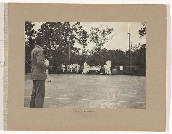 Editor: This is a gelatin-silver print entitled "Willem van den Berg op zijn boerderij in Transvaal, Zuid-Afrika," created sometime between 1967 and 1971 by Willem Jacob van den Berg. It strikes me as quite staged, almost like a documentary still rather than candid snapshot. What catches your eye in this piece? Curator: Well, for starters, I love how deceptively simple it is. It's more than just a farmer on his land, you know? The black and white strips away the romanticism, focusing on the relationships, the inherent tensions, between people, animals, the land, the legacy... Do you see how Willem van den Berg Sr. has placed himself with his back turned to the action? Editor: That's interesting, I hadn't thought about the turning of the back as intentional... Almost an act of witnessing but not really engaging. Curator: Precisely! What is he not wanting to see? And those workers pulling so hard. What does *their* sweat and toil mean in the bigger picture of South Africa during this time? This gelatin print, as beautiful as it may be technically, hints at complicated dynamics. Makes you wonder about the stories buried just beneath the surface of what *we* see. Does the land own them, or do they own the land, and at what cost? Editor: I see that the work is rooted in cultural and social questions now. It is a powerful image – unsettling, yet strangely…still. Curator: Absolutely. That tension, that disquiet, is where the real art often resides, isn't it? It lingers, invites us to feel more deeply. A deceivingly simple image with more beneath the surface.
