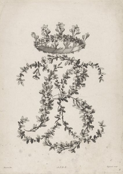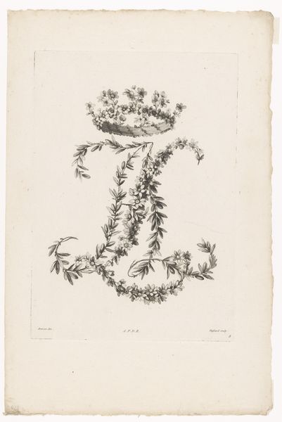 Etienne Claude Voysard created this print titled 'Letter I', using etching, around the late 18th century. The image presents a stylized letter 'I', adorned with floral and plant motifs, a design that reflects the period's interest in decorative arts. Voysard lived during the Enlightenment, a time when intellectual and cultural movements questioned traditional authority and embraced reason. Consider how the natural elements in the letter, the berries and flowers, are presented. In this era, nature was often viewed through a lens of scientific observation. This letter 'I' may represent an embrace of knowledge, intertwined with nature's beauty. As you observe the intricate details, consider how Voysard's work may reflect the complex interplay between nature, knowledge, and identity in the Age of Enlightenment.