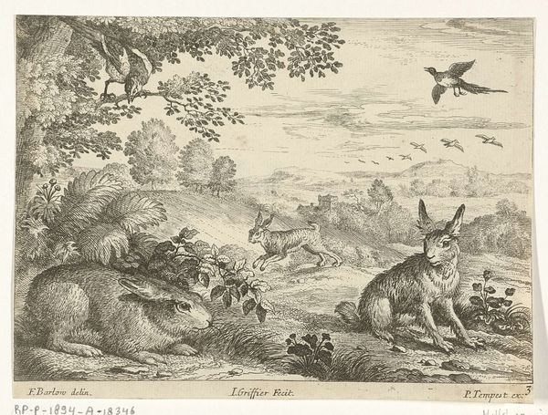 Editor: Here we have Jacob Gole’s "The Hunt for a Hare," made sometime between 1680 and 1723. It's an engraving on paper, depicting the chase scene, a tense moment. What historical narratives might be unfolding here beyond the immediate image of the hunt? Curator: Well, let's consider the societal implications of hunting scenes like this. It portrays the power dynamics of the era, doesn’t it? Who had the right to hunt, and what did that signify about their social standing? The image normalizes a violent interaction. What does this kind of image tell us about our relationship with the natural world and ideas about whose lives are valued over others? Editor: So, you are saying that this engraving isn't just a picture of a hunt but reflects class and human-animal dynamics. Does the portrayal of the hare – as a creature driven by fear – play into any specific cultural stereotypes about the vulnerable? Curator: Exactly! And consider the symbolism. The hare, often representing vulnerability and the feminine, is chased by dogs, symbols of aggression, representing male dominance and authority. Think about how these symbols are historically and consistently used. The act of hunting, in this context, can be seen as an assertion of control, echoing patriarchal structures embedded in 17th and 18th-century society. Do you see the narrative extending beyond just the visual elements? Editor: Yes, absolutely. It seems to uncover layers of societal power dynamics that I wouldn't have initially noticed. I hadn't considered the gendered symbolism. Curator: That’s the crucial point. By analyzing art through a critical lens, examining the themes of class, gender, and power, we gain insights into the complex cultural contexts that shaped these works, and reflect on our current realities. Editor: I’m beginning to see how much these older artworks speak to modern intersectional narratives. Thank you for unveiling those layers!