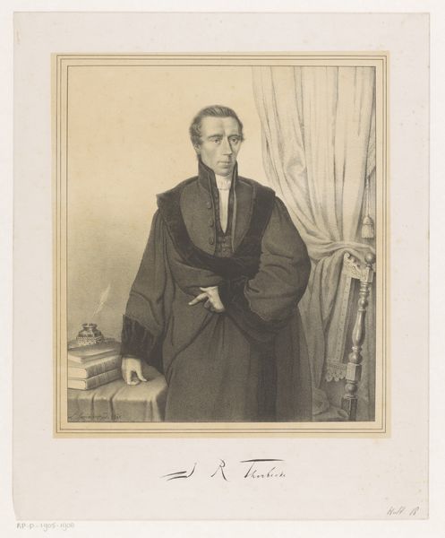 Curator: This pencil drawing, housed right here at the Rijksmuseum, is a portrait of Jan Rudolf Thorbecke by Carel Christiaan Antony Last. It's believed to have been made between 1842 and 1853. Editor: My first impression is of a man radiating thoughtful composure, almost severity, enhanced by the monochromatic palette. There's a strong sense of authority conveyed in this medium, oddly enough. Curator: I think it's the deliberate use of shadow and the meticulous detail that lends that gravitas. Last, while seemingly adhering to the aesthetic conventions of portraiture in his era, subtly infuses a sense of progressive liberalism into Thorbecke’s depiction. Editor: In what way? Is it his posture, the slight smirk that betrays a rebellious glint in his eyes or how can you detect hints of social reforms within its artistic DNA? Curator: Exactly. Consider the rise of bourgeois society and the growing emphasis on individualism during the 19th century. The portrait, in its ability to capture not just the likeness but the *character* of an individual, became a potent tool for solidifying social standing and propagating certain ideals. Think how Thorbecke’s expression hints at inner strength but also a willingness to engage. Editor: True, there's definitely an aura of purpose there. Yet, isn't there an element of romantic idealization here? It's interesting to see how social realism and romanticism intersect, especially in the political realm. Curator: Without a doubt. The artist is navigating that intersection, carefully constructing an image that speaks to the aspirations of a changing society. Notice his hand, gently posed, as if paused mid-speech. The drawing anticipates and helps construct Thorbecke's future legacy. The portrait then, performs crucial work, turning an individual into an idea. Editor: I think exploring portraits such as these beyond mere aesthetics allows for richer interpretation of what a political or social message means to the public then and even how we, today, assign new value to it based on intersectionality, whether it's of class or some other identifier. Curator: Absolutely. These pieces invite a layered analysis, linking social trends, personal narratives, and artistic representation to the broader discourse of history and how it’s actively shaped. Editor: It definitely shifted my first impression, reminding me of the power dynamics embedded within something as simple as a portrait and to what ends the final image is intended.