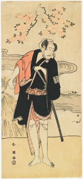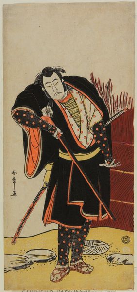 Editor: This woodblock print, "Kataoka Nizaemon VII as Ki no Natora," was created around 1794 by Tōshūsai Sharaku. The actor's intense expression is so striking. What do you make of the way Sharaku has portrayed him? Curator: The compressed lips, the furrowed brow—Sharaku is capturing more than just a likeness. Look at how the sword becomes an extension of that tension. The actor embodies the role, but Sharaku, through bold lines and exaggerated features, transmits something deeper about the character's inner state and cultural role. How does the crest influence your reading of the portrait? Editor: I hadn't focused on the crests before. Is that repeated symbol meant to emphasize his status, or is it related to the play itself? Curator: It is both, intertwining social identity and theatrical illusion. Family crests or *kamon* had deep cultural significance, functioning almost like a brand or identifier. Its presence here elevates the actor beyond his individual identity. But it is a theatrical representation. Can we separate the 'real' person from their cultural encoding? Editor: That's fascinating. So the actor's identity is wrapped up in layers of symbolism, from the *kamon* to the sword, expressing internal feelings, social status, and more. Curator: Exactly. And this is a vital key to reading Japanese woodblock prints of actors - this delicate, and culturally determined, layering of identities that is only partially apparent. Editor: Thank you. That helps me appreciate all that Sharaku conveys in this work. Curator: Yes, the art speaks clearly about that, once we learn to see.