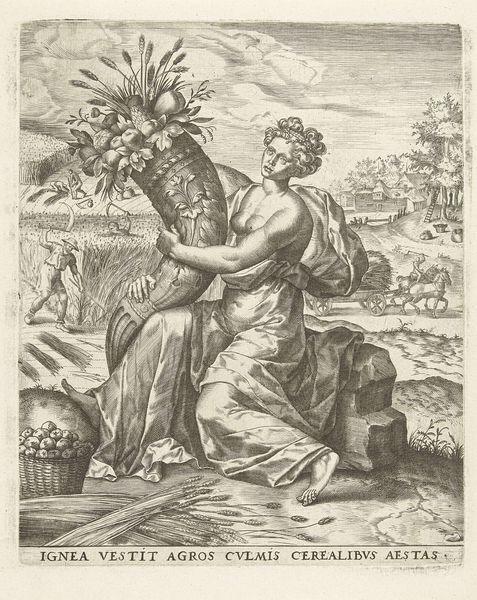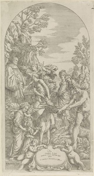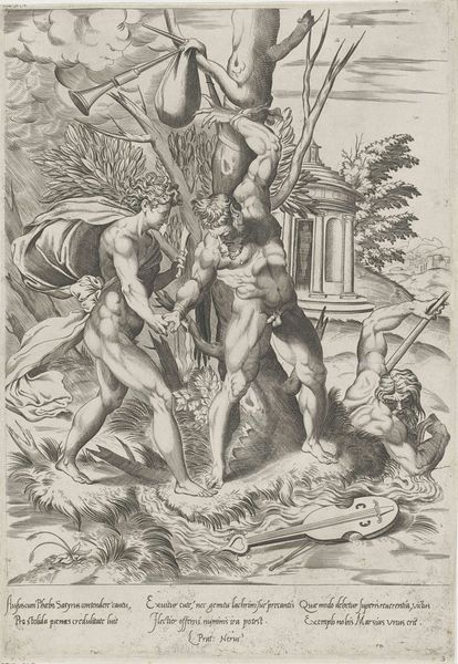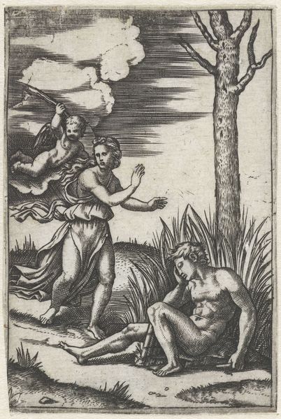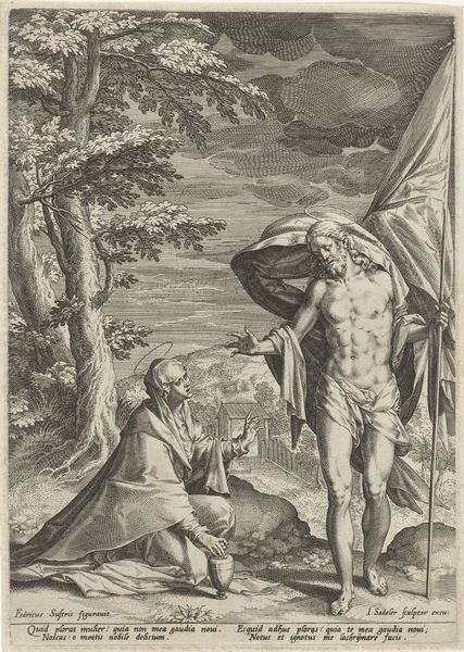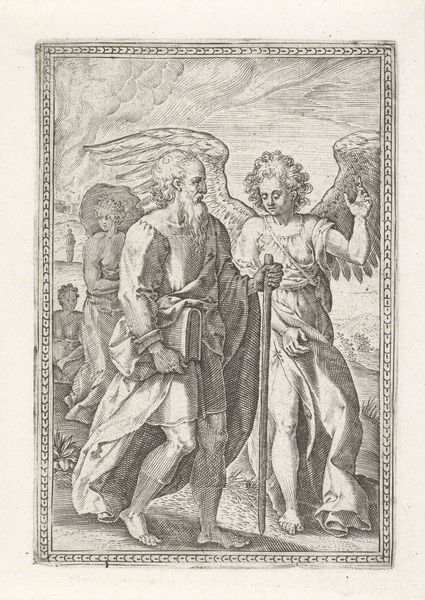 Curator: Johann Sadeler’s 1575 engraving, "Offer van Abraham," currently held at the Rijksmuseum, presents a tense, dramatic moment. What strikes you most upon seeing it? Editor: It feels…theatrical. Like a frozen scene from a play, all stark light and poised gestures. Abraham's raised hand, that gleaming blade, the angel's dramatic swoop – it’s incredibly intense. Curator: The use of engraving in this period allows for an intricate level of detail. Note the texture of Abraham’s beard, the feathered wings of the angel. How do these materials inform the piece’s meaning? Editor: It makes it so real, somehow. You can almost feel the grit of the metal on paper, the labor involved in creating that sharp, defined line. The story itself is, of course, about sacrifice and obedience, but this craftsmanship feels like another kind of offering. Curator: And the Northern Renaissance influence is undeniable here. There is a precision and seriousness evident, rooted in depicting not just a scene, but a weighty moral question of faith and divine command. The societal function becomes didactic. Editor: Exactly! That blade looks so incredibly heavy and unwieldy—not like something one could just casually wield. It speaks to that burden, the weight of obligation Abraham must be feeling at that very moment. Makes you consider how authority, be it divine or societal, relies so often on literal implements of coercion. Curator: Think also of the market for prints during the late 16th century. This wasn't simply art for the elite. It served a purpose in disseminating religious and moral narratives to a much wider audience. The materials facilitate its message on numerous social strata. Editor: It's interesting how this act, this sacrifice averted at the last second, translates. Is it a triumph? A mercy? To be honest, seeing it rendered like this...it’s unsettling. Even the "happy" ending, divinely ordained, is steeped in potential violence. Curator: That’s insightful. These images did circulate within systems of power— reinforcing ideas of submission and religious order through the consumption and spread of objects such as this. Editor: Looking at it this way challenges the narrative itself. Perhaps that tension, that unease, is exactly the point. Thank you, "Offer van Abraham", for making me question things! Curator: Indeed. Sadeler's engraving offers us a glimpse into the complex interplay of art, material, and social discourse.