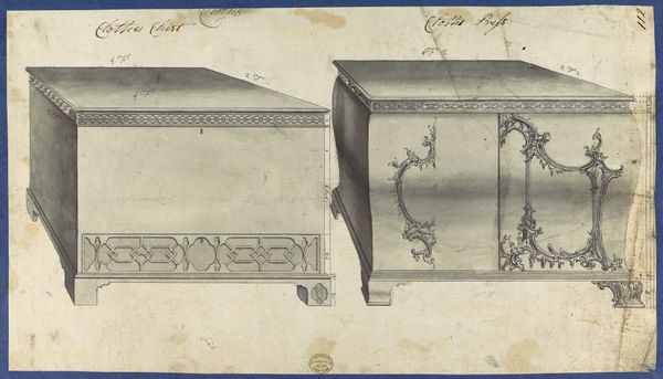 These are Thomas Chippendale's drawings for tea chests, part of a larger volume, which capture the 18th century's global trade and its impact on domestic life. Chippendale, a renowned furniture maker, operated during a time when tea became a coveted commodity in British society. These designs symbolize more than mere storage; they reflect the complexities of colonialism, class, and consumption. Tea, cultivated through exploited labor in distant lands, was imported by the British East India Company and became an essential part of elite social rituals. The chests, with their fine craftsmanship, served as both a status symbol and a container for a product deeply embedded in colonial power dynamics. The act of safeguarding tea within these chests underscores the value placed on this imported luxury. The drawing invites us to reflect on how everyday objects can embody histories of trade, power, and cultural exchange, stirring emotions tied to both personal indulgence and collective responsibility.