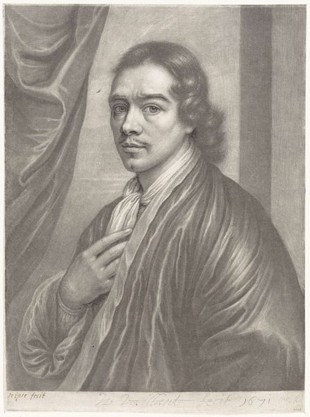 Curator: Ah, Wallerant Vaillant's self-portrait, etched sometime between 1671 and 1677. Look at how he captures himself here, residing at the Rijksmuseum now. Editor: It's wonderfully melancholy, isn't it? A wistful gaze… The monochromatic palette enhances that sense of quiet introspection. Curator: Right! As a portrait, of himself, no less! It really digs deep into something more existential. I am captivated by how Baroque masters approached capturing likeness. But of course it's just an engraving and not even painted; more of a 'print.' It all adds a fascinating texture that elevates the piece so vividly. Editor: Texture is spot-on! I'm intrigued by his choice of the mezzotint technique, so very involved to make subtle gradations in tone. Imagine the labor invested—preparing that copper plate! Each burr meticulously raised… the skill is just remarkable and all that preparation so the artist could express himself as someone of value! Curator: Absolutely! It's a reminder that even self-expression has its framework! Though Vaillant's not explicitly showcasing tools, he puts his hand upon his chest with almost royal poise and confidence. I feel this need to ask myself: is that performative, an honest impression, or simply for image's sake, with this self-portrait in a period hungry for visibility. It can’t not affect him! Editor: Precisely. His carefully chosen garb also tells a tale. It’s a controlled form of production isn't it; how someone adorns the self to have value for future viewers… It reveals so much about the socio-economic and even artisanal forces at play. That hand on his chest too, very deliberate in showing how valuable his skill makes him. Curator: The man and the means entwined. Ultimately, in those choices, he transcends just 'making' something. It shows someone in process, in both artistic ways and social means of value. Editor: Indeed. This exercise in rendering of Vaillant certainly offers food for further thought concerning portraiture production… Curator: Beautifully put; one way or another it keeps speaking!
