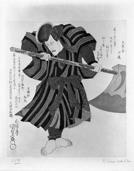 Curator: At first glance, I see bold simplicity; the stark contrast focuses my attention completely on the figure's assertive posture. Editor: Indeed. Let's delve into this striking print. Utagawa Kunisada created this work, titled "Actor Ichikawa Danjuro 7th as Sukeroku in the play Sukeroku yukari no Edo zakura." Curator: The umbrella, held high, is more than just a prop; it’s a symbol of status, a screen that both conceals and reveals the actor’s persona. Editor: Absolutely. Sukeroku was a popular character, and this image speaks to the Edo period's fascination with celebrity and the Kabuki theater. Curator: It is a clever cultural artifact, illustrating artifice that reflects and shapes public identity. Editor: The print offers a fascinating glimpse into the visual culture of its time.