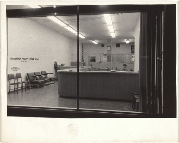 Curator: We’re looking at Robert Frank’s gelatin silver print, "Man asleep at desk--Indianapolis," created in 1956. Editor: My first impression is a sense of quiet resignation. The man's slumped posture, the dim lighting, it all contributes to this atmosphere of weariness. Curator: Precisely. Frank's selection of grainy textures and the high contrast are structurally integral to conveying the psychological mood, further amplified by the figure's dejected pose and the composition’s tonal range. Editor: But think of the historical context. The 1950s were a time of supposed American prosperity, yet Frank, as an outsider, captured these stark, unglamorous images of everyday life. This image subverts the ideal American narrative. The “elevator” sign is particularly evocative, since its arrow emphasizes this man's social stagnation. Curator: I see it, but more importantly, consider Frank's artistic technique. He doesn't idealize. He embraces imperfection, lending authenticity. The blurring and visible grain force us to engage with the materiality of the photographic process. Editor: The choice to focus on overlooked corners of American society was a deliberate political statement. He was revealing a reality often unseen. Curator: Perhaps. And while the socio-political aspect is certainly present, its artistic intention also deserves our attention. The subject is off-center, in fact in one-third section of the frame; however, the angle and shadow play emphasizes his face and fatigue, becoming formally relevant to the semiotic impact. Editor: It’s powerful how Frank challenges the prevailing narrative of his time. He really opens up dialogues about unseen America through these candid snapshots. I never noticed these stark juxtapositions, the tension between image and its cultural meaning, before your reading. Curator: Well, hopefully, our short chat gave everyone here more of an opportunity to look closer into this piece, and examine it further, too.