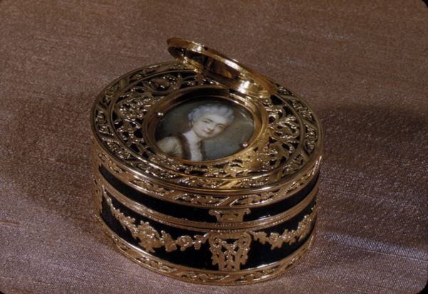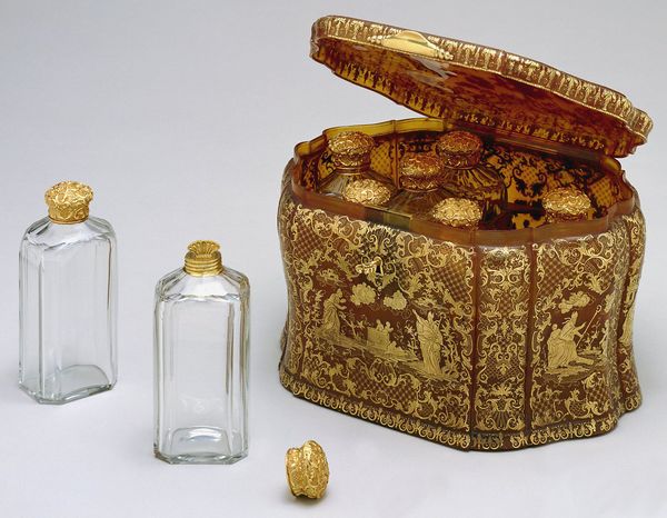 The box is decorated with scenes from the life of St. Nicholas of Myra. This fourth century Greek bishop, who was the patron saint of children, sailors and travelers and the guardian of young women, was the forerunner of St. Nicholas or Father Christmas. The gold scenes were applied in a piqué technique whereby thin sheets of gold are impressed into tortoiseshell which has been softened in boiling water and olive oil. Once the shell cools, it contracts and the gold is securely held in place. This technique was first introduced at the end of the sixteenth century in Naples, and by the following century it had spread to France, England and northern Europe, with Paris and Naples as the principal centers. The costly and time-consuming nature of this intricate technique imply that it was used on only the most expensive small luxury items such as inkstands, trays, snuffboxes and boxes for toilet articles, in this case gold-mounted perfume bottles.