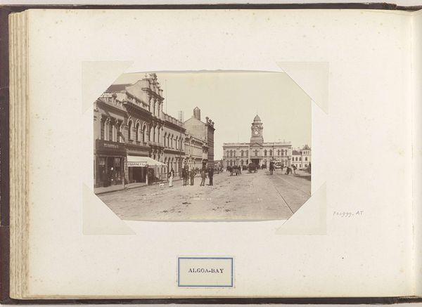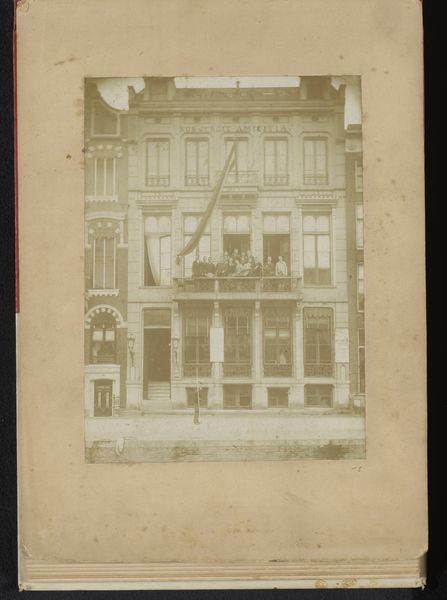 Curator: Nicolaas Schuitvlot's gelatin silver print, "Gezicht op Café de Kroon met de Amsterdamse Studenten Sociëteit N.I.A. te Amsterdam", made sometime between 1883 and 1903, presents a very composed street view. Editor: I’m struck by its stillness, a hushed quality almost, despite being a street scene. It's like peering into a perfectly preserved moment in time, rendered in a palette of soft grays. Curator: I find it fascinating how these seemingly mundane cityscapes, when looked at through a historicized lens, gain such an uncanny quality. Urban spaces are so rarely empty or static. Editor: Exactly. It invites speculation. What was it like for the women, absent in this picture, in fin-de-siècle Amsterdam to navigate and occupy these same spaces filled only by the "Amsterdamse Studenten Sociëteit"? It’s interesting what histories are visibly present and which remain unseen in this image. Curator: I suppose that is why they remain, ghostly absences, their histories still demanding to be explored. It's fascinating to think of the vibrant debates about labor, the rise of socialist movements, and, importantly, burgeoning feminist organizing happening precisely when Schuitvlot pressed the shutter on his camera. Editor: And how do these buildings represent social division? In a lot of ways, aren’t these rigid, structural binaries replicated in the way social spaces were strictly coded during this period? Look at that architecture and compare it to workers’ houses. You can tell exactly who belonged where. Curator: Mmh. Thinking about this photo from Schuitvlot, this glimpse into the past—it seems so tangible, like if I focus just hard enough, I could simply step right into it. The city breathes still with all the hidden voices that continue echoing throughout its walls. Editor: Definitely. It’s an enduring reminder to examine any artwork as more than just what is presented, but who it’s speaking to, and for, in the ongoing negotiation between what is rendered as publicly visible and what gets pushed to the margins.
