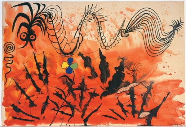Editor: This is "Diluvial" by Alexander Calder, created in 1953. It's a mixed media piece with acrylic paint, watercolor, and ink. There's a real sense of dynamic energy here, a kind of organized chaos in the abstract forms and contrasting colours. How do you interpret this work? Curator: Considering the socio-political climate of 1953, during the height of the Cold War, "Diluvial" seems to tap into anxieties surrounding potential destruction and transformation. The title itself, referring to a great flood, might allude to the fear of nuclear annihilation permeating the public consciousness. Notice how Calder uses these abstract forms. Do you see any symbolic figures arising from the depths, fighting the sky's destruction? Editor: I see what you mean about a looming threat, almost like something emerging from the chaos. The geometric shapes, especially the stark black lines against the brighter colors, definitely create a sense of tension. So, you see the work as less of a pure abstraction and more as a commentary on the anxieties of the time? Curator: Precisely. Calder, while known for his mobiles celebrating movement and balance, was not immune to the societal pressures around him. Abstraction, for many artists of this period, became a way to express the unexpressable, to grapple with feelings too complex or dangerous to articulate directly, especially with looming questions around visual presentation of imagery within governmental standards and Cold War censorship. The use of readily sourced and cheap material meant he could get it “out there” quicker as well. How might this have affected audience perceptions at the time? Editor: That's fascinating, and I never thought about the political dimensions influencing even abstract works like this. It makes me see the painting in a whole new light. Curator: Indeed. By examining art through the lens of its historical context, we gain a deeper understanding of its cultural significance and its resonance with the audience it aimed to inspire, especially when the art reflects political climates. I hope to share even more another day.