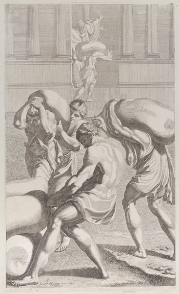Editor: This is Walter Crane's "In the Earliest Times a Simple Foot-Race Was the Only Event," a watercolor illustration depicting a scene from ancient Greece. It's such a vibrant and energetic depiction. What symbols and traditions from Ancient Greece do you recognize, and what do they mean in this image? Curator: This illustration captures the symbolic essence of the early Olympic Games. Observe how Crane emphasizes the nude male form. It reflects the Greek ideal of physical perfection, resonating with notions of heroism, and aristocratic virtue central to their society. Consider how even the wreaths worn on their heads weren't just decorative, but signified victory and honor. Editor: That’s fascinating. I hadn't thought about the wreaths representing honor in that context. What about the setting? Is that meant to carry a symbolic meaning too? Curator: Precisely. Notice the architecture in the background, a stylized vision of Greek temples and structures. They locate the games within a framework of civic pride and religious devotion. The distant mountains could suggest the challenges and endeavors undertaken by the athletes. How does that composition influence your experience of the artwork? Editor: I suppose I see it now as more than just a race. The placement within the grand setting and their focus reinforces the magnitude of what they are doing in that moment. Curator: Exactly. Moreover, contemplate the image's reflection of cultural memory. It reimagines the past, inviting viewers to reflect upon present ideas of sportsmanship. It’s how cultural identity preserves itself and evolves. It offers us a continuous connection through symbols of tradition and competition. Editor: I see, a lens through which we connect to our history, thanks! Curator: Yes, exploring the memory carried by these visual symbols offers insight into historical values and enduring cultural patterns.