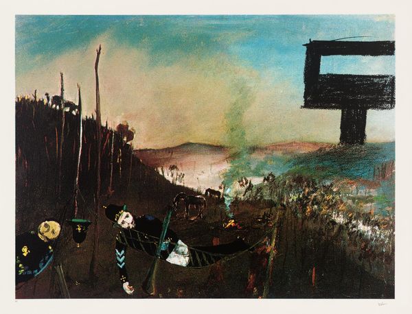 Editor: What strikes me first about this work is the texture—the palpable roughness of the paint makes me think about what Nolan might have been feeling in that moment, so immediate. Curator: Indeed. This is Sir Sidney Nolan's "The Burning Tree," housed here at the Tate. Note how Nolan uses the motif of the burning tree to suggest themes of destruction and perhaps even purification through fire. Editor: Looking closer, you can almost feel the heat radiating from that tree. I wonder, what kind of paints did he use? The thick application speaks to a certain urgency, or perhaps a struggle with the medium itself. Curator: The composition is quite striking, isn't it? The stark contrast between the cool blue sky and the fiery landscape below creates a tension that's hard to ignore. The figures also give a sense of the event's scale and historical context. Editor: For me, it raises questions about labor and resources. Where did Nolan source his materials? What was the economic landscape surrounding this piece's creation? Curator: Ultimately, the painting offers a powerful meditation on transformation. Editor: It definitely left me pondering the physical act of painting and its connection to the subject.