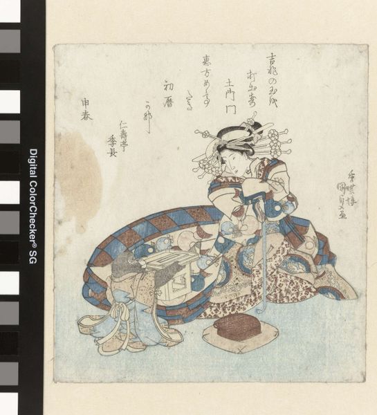 Curator: Let’s discuss this print titled “Twee jongens met hond,” or "Two Boys with a Dog," made around 1790 by Utagawa Toyokuni I, currently held in the Rijksmuseum. What's your immediate response? Editor: I find it oddly endearing, though there’s a prevailing sense of subdued social control—not overt, but certainly implied through dress, leash, and staging in this woodblock print. Curator: Focusing on formal elements, I’m struck by how the artist utilizes line and space to create depth. Notice how the delicate lines of the bamboo contrast with the patterned kimonos. The perspective directs the eye subtly, creating focus in an uncluttered field. Editor: But those patterns aren’t just decoration. The clothing indicates socioeconomic status within the rigid Edo period. Consider too the leashed dog. Not necessarily a “pet” in the modern sense but a mark of privilege displayed in public. It reflects how class dictated visual representation. Curator: Perhaps. I'm fascinated with the relationship of negative to positive space, typical of Ukiyo-e prints. The blankness makes one contemplate balance and the suggestion of environment. Observe, how light these figures stand against a vast background. Editor: That “blankness” highlights power dynamics. The boys, dressed and positioned just so, represent the structured expectations put upon them, part of a generation under strict authority. The print visualizes conformity. Curator: Is the print not able to depict simply, shall we say, daily life? Are we doomed to always read the artwork’s political stance, without some consideration for a casual scene? Editor: “Casual” only exists within a context, though. To overlook how dress, leisure, even companionship like that dog were shaped by sociopolitical conditions would mean missing what the print subtly communicates. Curator: Well, I appreciate the image's refined craftsmanship, even if I cannot commit to reading the artwork to mean more than what the artist literally presented on the paper: a genre painting. Editor: Then let us agree to disagree, in terms of context, yet value, in equal measure, this delicate intersection of aesthetics and implicit power as it appears here in this scene.