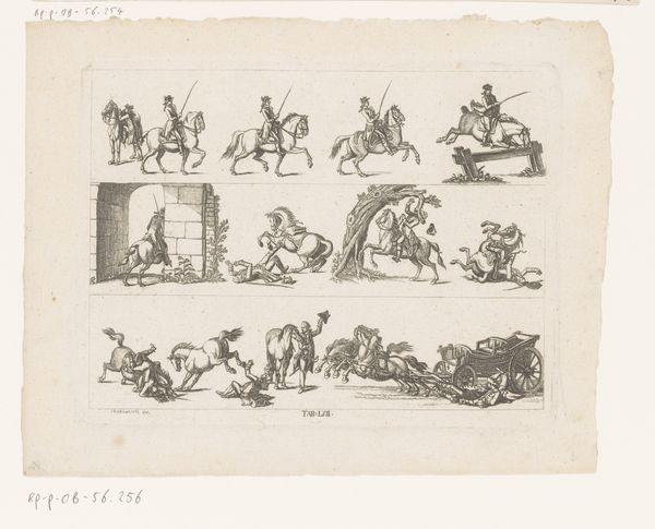 This print titled "Apen en honden-komedie," or "Monkeys and Dogs Comedy" was created by E. Ille. We don't know the exact date, but it was produced using a printing press, which allowed for the mass production of images like this. The print depicts monkeys and dogs dressed as people, mimicking various social roles and professions. The artist utilized the process of etching or engraving, meticulously carving lines into a metal plate to create the image. This labor-intensive process allowed for detailed and precise imagery, seen in the intricate costumes and expressive faces of the animal characters. The choice of printmaking as a medium ties directly to social commentary. Prints like these were often used to satirize society, making observations about class, politics, and human nature accessible to a wide audience. The act of producing and distributing prints was itself a commentary on the emerging culture of mass media and consumption. By examining the materials, making, and historical context of this print, we gain a deeper understanding of its artistic and social significance, bridging the gap between fine art and popular culture.