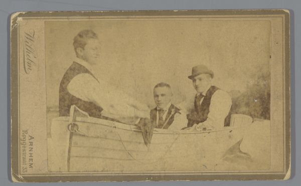 This studio portrait of four men in a rowboat was produced by Jacobus Marinus van der Peijl, although we don't know exactly when. The whole scene has a sepia wash, giving it a real sense of age, like a memory fading at the edges. There’s something so artificial about this image. The backdrop of the forest, the strange light on the water. It all feels like a stage set. But maybe that's the point? To create a reality that's slightly off, a little dreamlike. Look at the brushstrokes in the water. They’re so loose and gestural, not trying to mimic reality, but instead creating a sense of movement and depth. The man standing in the center is the most clearly defined. His crisp suit and top hat create a bold statement against the washed background. This reminds me of Gerhard Richter’s blurred photographs. Richter's work embraced the imperfections and ambiguities of human perception. Like Richter, van der Peijl invites us to question the very nature of representation. It’s a world that’s open to endless interpretations.
