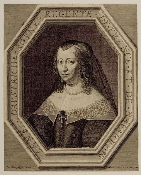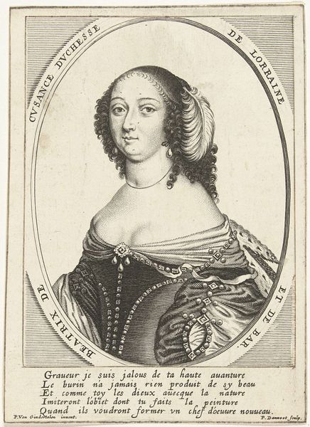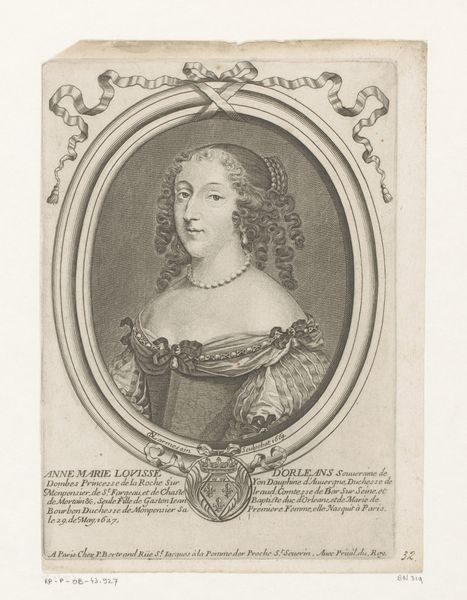 Curator: This is an engraving dating from around 1630 to 1710, known as "Portrait of a Courtesan." It is currently held in the collection of the Rijksmuseum, but was created by an anonymous artist. Editor: My first impression is that it possesses an airy lightness despite being so densely packed with lines. The artist has used intricate cross-hatching to suggest texture, especially in the subject’s cascading hair and the ornate lace collar. Curator: Indeed. The portrait offers us insight into the social conventions and perceptions of women during the Baroque period. What does it say about the position of the so-called "courtesan" in the socio-political structure? We could question who this engraving was intended for and where and why it might have been displayed? Editor: I find it fascinating how the oval frame both confines and emphasizes the figure, directing the gaze inwards. Notice the subtle variations in line weight to define her facial features. A delicate rendering, yet somewhat idealized perhaps, softening the supposed subject matter. Curator: It’s also relevant to consider that this image would have circulated among a specific audience within a society marked by rigid class distinctions and social expectations. Engravings, particularly of public figures whether scandalous or otherwise, became a very effective method for communicating ideology. Editor: Absolutely. Semiotically, the use of light and shadow gives a feeling of depth within what is actually a very flat image. The repetitive curve of the lines evokes sensuality and an interesting approach to three dimensionality considering the two-dimensional plane. Curator: Examining it today reminds us how images shape narratives and public perceptions—even those constructed anonymously so long ago. I wonder what we are intended to discern from the portrait besides immediate impressions? Editor: It truly makes you appreciate how form and content come together, to not only create a depiction, but also provoke discourse, doesn’t it?