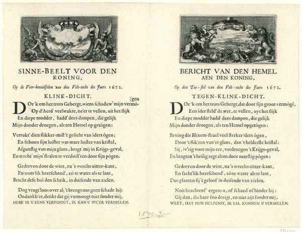 Curator: This engaging engraving, dating from around 1721-1723, presents a historical tableau, titled "Twee penningen ter ere van burgemeester Pieter van der Werff, 1604." It appears to be a homage to Pieter Adriaansz. van der Werff, a significant figure in Dutch history. Editor: Oh, I love the quaintness! It feels like stumbling upon a cherished old book in a forgotten corner of a library. But that stark, linear style… it does leave you feeling somewhat detached, doesn’t it? Curator: The detachment, I think, is intentional. The engraver, whose name remains unknown to us, prioritizes clarity of line and form, allowing the viewer to dissect the composition, rather than be swept away by emotion. Consider the composition; four medallions are presented, and attention should be given to their placement and relation to the other surrounding medallions. Editor: Right. The dual portraits of van der Werff in profile. Each has that stiff 17th-century solemnity. Then the central medallions—look closer and you can discern the quaint skyline nestled below all that calligraphy... Curator: Indeed. The inclusion of calligraphy adds to its complexity; in those central medallions, two verses, likely written in the Dutch vernacular, function almost as mini historical records and provide essential details regarding the life and accomplishments of van der Werff. Notice how the inscriptions act to historicize his legacy through textual emphasis and visual design. Editor: Van der Werff, clearly, was quite the local hero. Based on the inscription and imagery, I sense resilience, civic duty, and perhaps a touch of the stoic. He braved some fiery ordeals for “the freedom of the land.” It really echoes that time! Curator: Precisely. This work exists as more than a simple commemorative artwork. The careful attention paid to line and text serves a larger project which commemorates not just an individual, but civic responsibility in service to national ideals of resilience and courage, and this elevates its significance. Editor: Well, I came looking for something sentimental and found this slice of history—stark, poised, and perfect for a history book. Maybe "detachment" is the wrong word. Call it 'contained intensity.' I walked away feeling moved after all. Curator: Agreed. The 'contained intensity' stems from that rigorous aesthetic, and our focus on those qualities yields its complex beauty. This engraving achieves something rare: a stoic monument to civic devotion that still resonates across centuries.