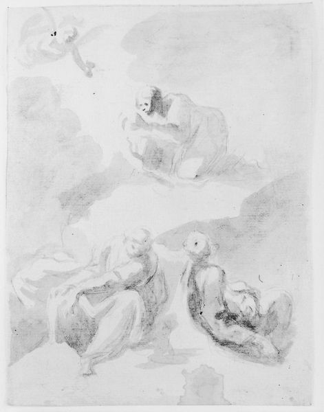 Editor: This is Fragonard's "The Dormitory," a sepia wash drawing. It's so delicate and airy, almost like a dream. What symbols do you see at play here? Curator: The canopied beds evoke ideas of privacy and ritual, while the figures' flowing garments connect them to classical ideals of beauty and leisure. Do you notice how the central figures, cloaked and facing each other, serve as an emblem of unity or perhaps secrets shared? Editor: I see that now! So it's not just a domestic scene, but something deeper? Curator: Precisely. Think about the shared spaces of women; the dormitory becomes a charged space for intimacy and social bonds, echoing a deeper cultural memory of female communities and their unspoken narratives. Editor: That's a really interesting way to look at it. Thanks! Curator: My pleasure. It's always rewarding to see how art can reveal hidden histories and enduring connections.