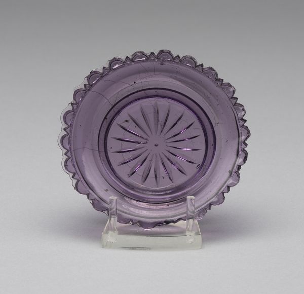 Editor: So, this charming cobalt-blue glass piece is called "Cup Plate," and it dates from 1830 to 1835. The artist is listed as anonymous, and it resides here at the Art Institute of Chicago. It’s giving me a sort of antique Americana vibe, and it's surprisingly intricate for such a small object. What leaps out at you? Curator: Oh, isn’t it a darling? It reminds me of simpler times when folks had a touch more ceremony in their lives. Imagine the scene: ladies and gentlemen sipping tea, using this very plate to avoid drips— a moment frozen in time! That striking eagle at the center— does it not give you the feeling of gazing into a pool of national pride, back when Neoclassicism was all the rage? Do you think the deep blue hue evokes that feeling further? Editor: Definitely. I mean, the eagle’s so prominent, surrounded by what looks like stars. Was it common to see patriotic symbols on everyday objects? Curator: Absolutely! Think of it as a daily dose of patriotism. Mass production allowed for images like this to spread far and wide, democratizing access to…well, national symbolism. And remember, back then, glass was relatively precious. Can you imagine how delighted one might be, to have something beautiful *and* useful? It really is delightful, isn’t it? What's your biggest takeaway here? Editor: That even simple objects can be little vessels of history and national identity. I’ll definitely be paying closer attention to the decorative arts from now on! Curator: Indeed! It's a potent reminder to find the beautiful stories in everyday things. Wonderful.