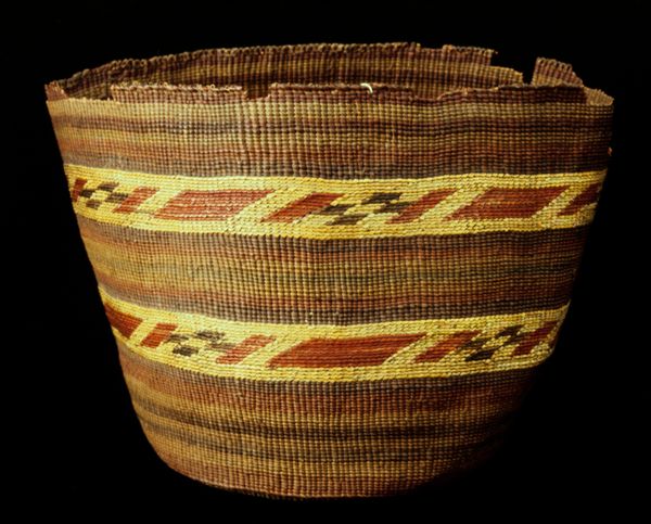 Curator: What strikes me first about this Basket, likely created by an Akimel O'odham (Pima) artist around the 20th century, is its undeniable sense of quietude. Editor: It's certainly visually compelling! The geometric pattern is incredibly precise, creating a dynamic rhythm around the form. I immediately wonder about the historical context. What was the role of these baskets within the Akimel O'odham community at the time? Curator: Functionally, baskets like these were often used for food storage or preparation. However, the patterns are more than just decorative; they represent deep connections to the natural world and cosmological beliefs. Those diamonds, for instance, could symbolize important figures or cardinal directions in their mythology. Editor: Absolutely. And it also is an intersectional exploration, representing both utility and something deeply personal about the maker's worldview, perhaps a reflection on the gendered role in the family life and community. The time spent meticulously weaving, creating these patterns, speaks volumes about the artistic practices that women had. Curator: That's very insightful. Weaving has long been intertwined with feminine identity and skill, and in Indigenous communities, these artistic roles were often integral to cultural preservation. Do you see any visual echoes of other cultural objects? Editor: In terms of the symbology of the image, it recalls ancient weaving motifs across various cultures, evoking similar needs, and concerns across them all, revealing fundamental human constants across traditions and eras. The shared need to connect with our origins, natural surrounding, and to communicate that knowledge forward. Curator: Precisely. This seemingly simple woven vessel contains so much history. Editor: Looking closer, you start noticing tiny details – slight shifts in tone, uneven tensions – which remind you about human skill but also, more importantly, that hands shape everything around us. Curator: Yes, seeing this "Basket" through that lens allows a broader appreciation of artistic value for historically underrecognized artisans and the meaning they are adding to everything. Editor: It's been enlightening to think of this basket beyond just a material object but rather a vessel filled with stories and encoded messages about Akimel O'odham experience.