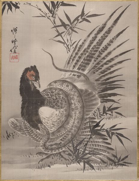 Curator: Kawanabe Kyōsai's "Fox Catching Bird" is rendered with an evocative use of ink on paper, crafted sometime between 1877 and 1897 during the Meiji period. Editor: Well, my first impression is a real sense of immediacy and energy. That fox is all mid-air desperation. Curator: Indeed. The dynamic pose and realism stand in contrast to the more stylized elements around it. Observe how Kyōsai uses varying ink washes to describe the texture and volume of the fox's fur against the bird's feathers. Editor: You can almost feel the scrabble for life in the details—the claws, the panicked flail of wings. I wonder what Kyōsai was thinking. Did he see this happen, maybe? Or is he drawing on something deeper, primal perhaps, something about the food chain ballet? Curator: Consider the interplay between chaos and composition here. The seemingly random scattering of leaves and bamboo in the foreground creates depth and leads the eye back to the central drama of the fox and bird. Semiotically, the fox represents cleverness and cunning. Editor: Oh, I buy that. But the execution! It is just raw emotion. A predator locked on its prey and pure instinct on display. Life and death played out in miniature. The bamboo almost feels like a curtain rising on a stage set. Curator: Precisely, it’s a calculated construction. Look at how the ink's tonality shifts. Dark, bold lines for the central action give way to lighter, more atmospheric washes at the edges, thus containing the vital action at center stage. Editor: So, in this little scene Kyōsai's captured something monumental and distilled it. Nature red in tooth and claw—scaled down for our viewing pleasure and philosophical pondering. A real clash of beauty and brutality. Curator: Precisely. By drawing on both direct observation and a keen sense of theatrical presentation, Kyōsai has delivered something both brutally direct and powerfully universal in the "Fox Catching Bird". Editor: Well, looking closer I am glad I don’t need to make a living trying to get lunch in that scene. That’s really saying something, though, isn’t it? What a thing.