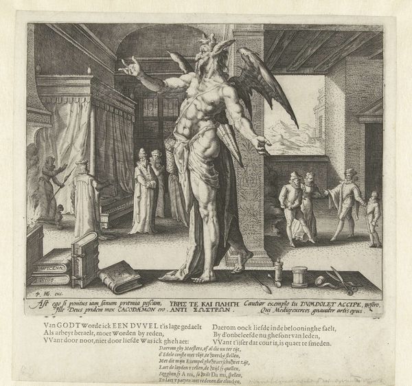 Hendrick Goltzius made this print, "The Doctor as a Human," sometime around 1600 in the Netherlands. It's an interesting work that raises questions about the role of doctors in society and how they were perceived at the time. We see the doctor standing confidently, almost as a gatekeeper, between scenes of sickness and health. The composition implies that doctors held a privileged position within the social hierarchy. The print includes Latin and Dutch texts, suggesting it was intended for an educated audience, perhaps even for doctors themselves. During this period, medical knowledge was expanding, but so was skepticism about doctors' true abilities. Was Goltzius celebrating the doctor's art or satirizing the profession's self-importance? To fully understand, we might consult medical texts from the period or examine records from hospitals and guild organizations. Art history isn't just about looking; it's about researching and understanding the context in which art is made and seen.