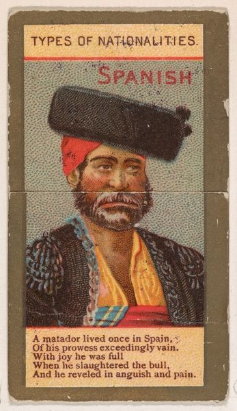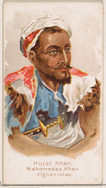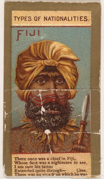 This small card, "Moorish, from Types of Nationalities," was made by the Kinney Brothers Tobacco Company. Though it appears to be a simple paper print, its significance lies in its mass production. Printed through industrial processes, this card was one of many inserted into tobacco packages. The very qualities of the card – its thinness, its glossy surface, the precision of the printed image – all speak to its origins in a factory setting. Consider, too, the sheer quantity of these cards that must have been produced, distributed alongside a consumer product, and collected or discarded by consumers. The card’s subject is a stereotype, a figure reduced to a set of presumed characteristics. This makes the card an artifact of social history, tied to issues of labor, politics, and consumption. The card challenges traditional distinctions between fine art and craft, prompting us to consider how mass-produced images shape our perceptions and perpetuate stereotypes.