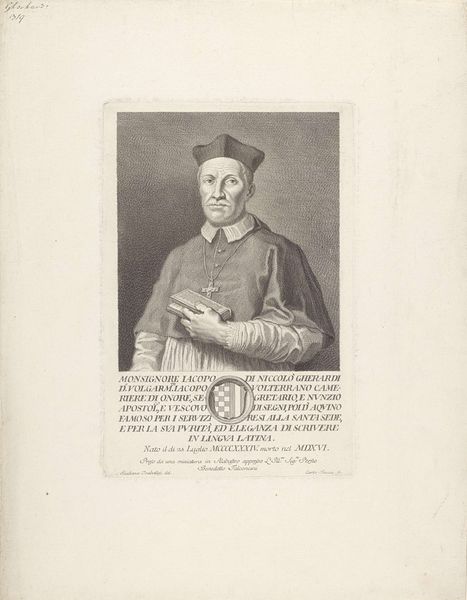 Editor: This is Pieter Tanjé's "Physician of Corregio," a striking plate print. I'm intrigued by the subject's stoic expression and the prominence of the large book. What can you tell me about the historical context surrounding this image? Curator: This print, likely based on an earlier painting, speaks to the rising status of artists in the 18th century. Consider how Tanjé is not just replicating an image but also participating in constructing the cultural significance of Correggio. Why focus on a physician, though? Editor: Perhaps medicine was seen as a respectable profession, lending prestige to the artist? It's fascinating how art can reflect and shape social values. Curator: Exactly. The print serves as both a portrait and a statement about the value society placed on knowledge and artistic legacy. Editor: I never thought about it that way! Thanks!