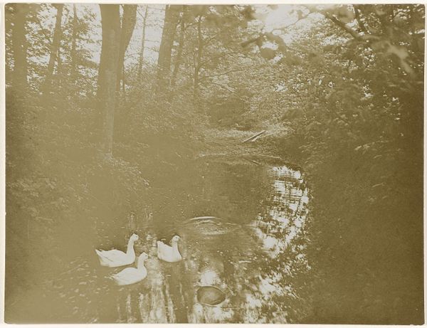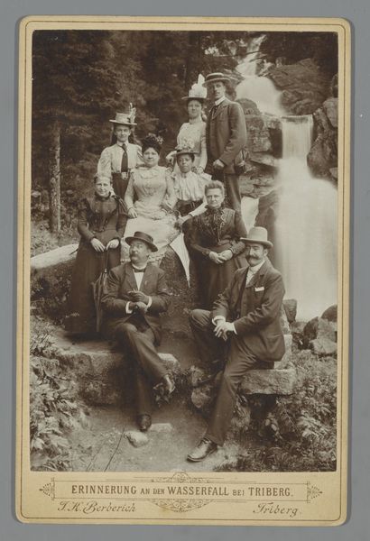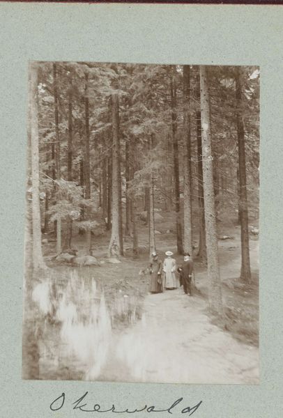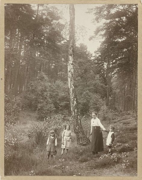 Editor: This is "Company with the Kessler Family Walking in the Forest," a photograph taken after 1903, currently housed in the Rijksmuseum. I’m struck by how staged it feels, yet also a little eerie. The way they're all positioned in this dense forest makes them appear both connected and isolated. What visual cues stand out to you, and how might we interpret them? Curator: It’s fascinating how the photograph’s composition mirrors the family hierarchy, isn't it? Notice the root system acting as a natural plinth. Consider the image as a constructed tableau vivant – a 'living picture.’ What purpose do you think staging nature this way serves, considering it’s an art of selection? The family grouped as visual synecdoche embodies progress and familial continuity. The surrounding forest— the trees forming cathedral-like vertical lines—resonates as a culturally understood metaphor for legacy and endurance. Editor: That makes a lot of sense. So, the forest isn't just a backdrop; it’s more of a symbol of the family's roots and their aspirations. But the ‘eerie’ element I sensed… is that related at all to photography’s capacity to freeze time and capture mortality? Curator: Precisely. Early photography, particularly portraiture, often served as a memento mori, a reminder of our fleeting existence. The careful composition attempts to transcend that inherent tension of stillness against time. Does their specific attire also play into that tension of place and belonging, especially compared to the rooted nature around them? Editor: It does – their formality contrasts with the wildness. So, the photograph uses the visual language of family portraiture to express themes of history, legacy, and even mortality within a specific cultural context. Curator: Precisely. And the Kessler family, by positioning themselves so deliberately within it, seek to participate in and shape their own narrative within that landscape. Editor: I see that now. Thanks; I’ll never look at a staged family photo the same way again!
