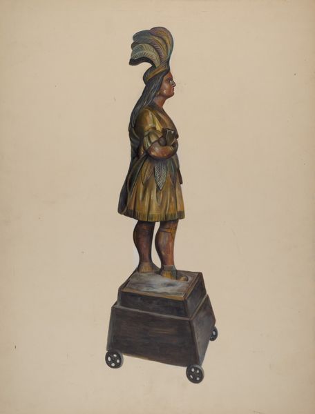 Curator: I am immediately drawn to the figure's stoic pose and almost ghostly coloration; the wood's texture seems tangible, hinting at a story beyond the surface. Editor: Well, let's delve into that story. We are looking at "Medicine Man," a drawing Yolande Delasser created around 1937, done with graphite and watercolor on paper. Curator: Delasser chose very deliberate materials, graphite providing structure and watercolor allowing a limited range of subtle hues; why paper though, I wonder about that decision, rather than directly onto the carved form... Editor: That’s an interesting question! It likely stems from Delasser’s interest in documenting and celebrating American folk art. By creating a drawing, she was preserving this specific carved wood figure of a character, C.B. Sellers, within the art historical record, providing a portable representation suitable for distribution and appreciation beyond its immediate context. This choice effectively elevates the status of what may have originally been considered a purely functional or decorative object. Curator: True, the act of documentation and representation is key here. Look at how she mimics the rough textures of the wood with her strokes and rendering: her treatment makes me reflect on what these wooden caricatures were originally intended for. Were they truly considered "art," or did they merely serve as advertisements or populist effigies, devoid of institutional significance? Editor: They were certainly part of the vernacular landscape! Such folk sculptures were deeply embedded in local communities, expressing values and identities often marginalized by mainstream cultural narratives. Artists like Delasser, by drawing them, challenged the existing hierarchy of art by drawing attention to their cultural significance and the skill involved in crafting these figures, emphasizing the working-class roots of creativity. Curator: It highlights the tension between the artwork and its representation—drawing as labor reflecting on labor in woodworking and even advertising. This is no simple portrait; it’s an index of processes of creation and how folk art inserts itself in the social sphere! Editor: Absolutely. By focusing on a "medicine man," the image hints at themes of healing and well-being, but also perhaps skepticism and charlatanism, issues deeply relevant during the economic hardship of the 1930s, adding another layer to this seemingly straightforward portrait. Curator: It's really more than just a quaint rendering of American folk tradition, isn’t it? A complex distillation of the anxieties, beliefs, and aesthetic sensibilities during a pivotal point in US history. Editor: Exactly! And from an art-historical viewpoint, understanding pieces like this can change our entire framework of "American Art," placing marginalized voices into the story.
