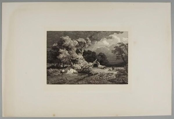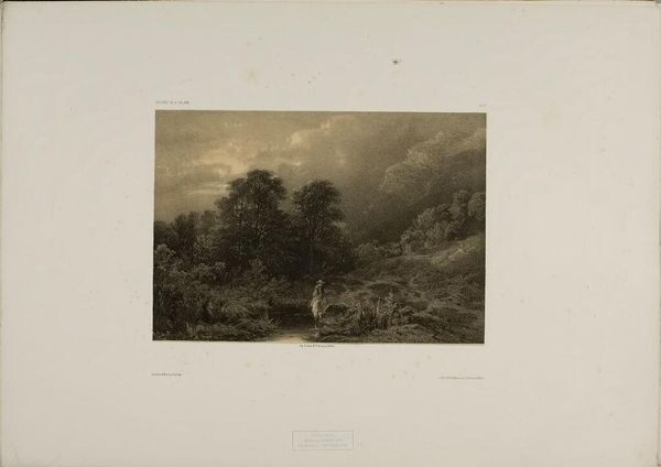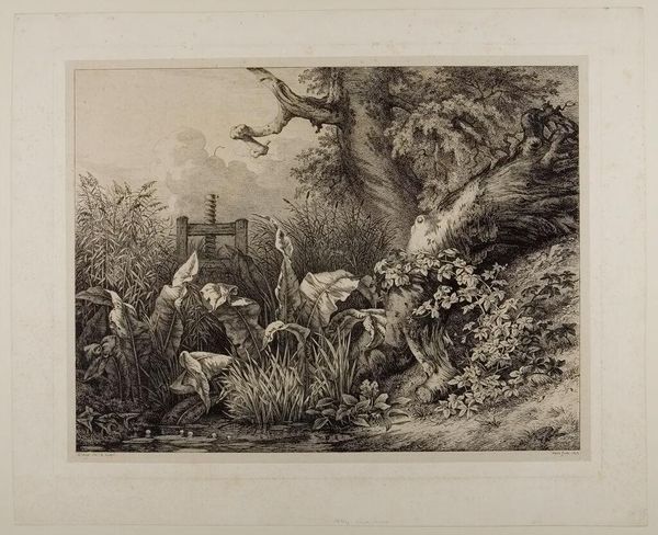 Curator: This is Eugène Stanislas Alexandre Bléry's "Dock and Brambles at the Sluice," held here at the Harvard Art Museums. It feels incredibly still, almost suspended in time. Editor: It has a lovely, almost romantic quality. I'm interested in how Bléry captured this scene through the printmaking process. Look at how the marks build up this dense, almost tangled landscape. Curator: Indeed, the material choices shape our perception. This print likely circulated widely, bringing imagery of the natural world to a broader audience than paintings could. Editor: The sluice gate presents a tension: nature and its human management. The image likely reflected the period's views on land use and resource control. Curator: So, as we consider its history, it reminds us that art is deeply intertwined with the social and cultural values that shaped its creation. Editor: Absolutely, and thinking about how these prints were made and distributed gives us insight into the lives of both the artist and his audience.